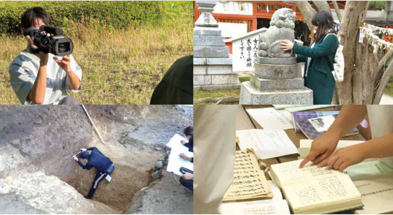人間の社会文化的な営みを、歴史学、フィールドスタディーズ(考古学、地理学、民俗学、芸能論、社会学、文化人類学)、情報メディア論の各領域を通じて学びます。歴史学では、資料・史料や文献を自分で探し、読み込む力を身につけ、世界中のさまざまな地域の人々が何千年にもわたって繰り広げてきた営みを明らかにします。フィールドスタディーズでは、直接現地に足を運び、自らの目と耳を使い、五感を働かせて調査し、社会や文化の仕組みを考えていきます。情報メディア論では、私たちの日常生活を形作っているメディア文化を分析的に考える基礎を養います。