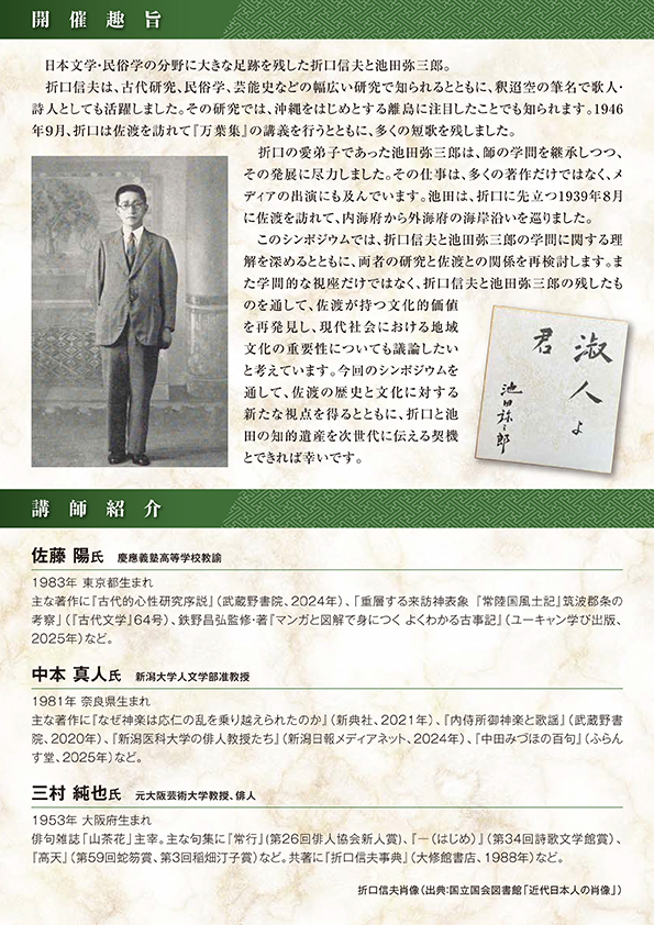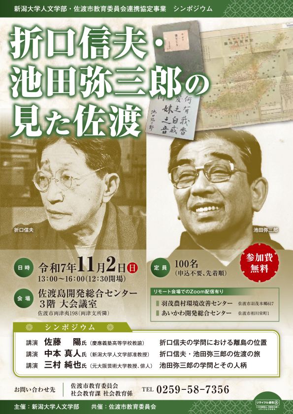 来る11月2日(日)佐渡市佐渡島開発総合センターにて、新潟大学人文学部・佐渡市教育委員会連携協定事業シンポジウム「折口信夫・池田弥三郎の見た佐渡」が開催されます。どうぞ奮ってご参加くださいますようお願いいたします。