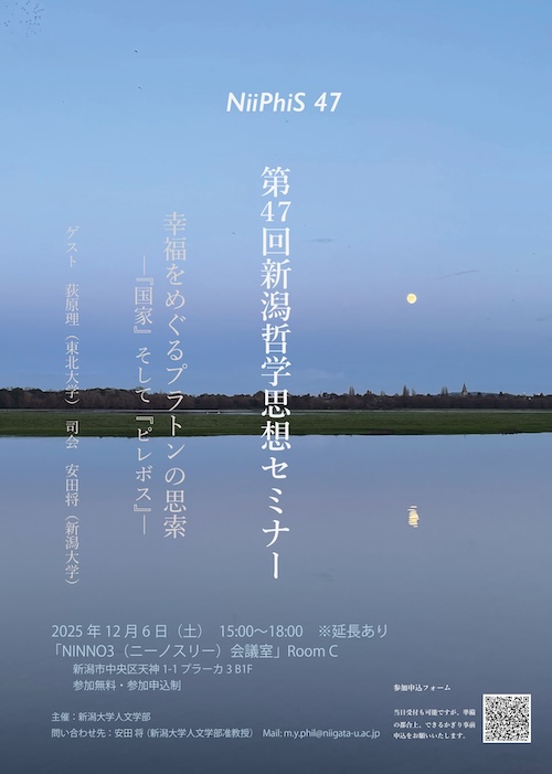 新潟哲学思想セミナー(Niigata Philosophy Seminar:通称 NiiPhiS[ニーフィス])とは2009年に新潟大学を中心に立ちあがった公開セミナーです。新潟における知の交流の場となるよう、毎回、精力的にご活躍の講師をお招きして、哲学・思想にまつわる諸問題に積極的に取り組んでいきます。参加費不要です。どなたでもご自由にご参加ください。