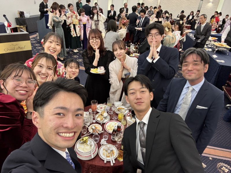 最後になりますが、この祝賀会を開催するにあたって多くのご支援をいただいた同窓会、後援会の皆様、会の準備を進めてくださった人文学部学務係の皆様、お忙しい中ご出席くださった人文学部の先生方に改めて御礼申し上げます。そしてここにはいませんが、4年間の学生生活を支えて下さった保護者の皆様にもこの場を借りて感謝を申し上げます。