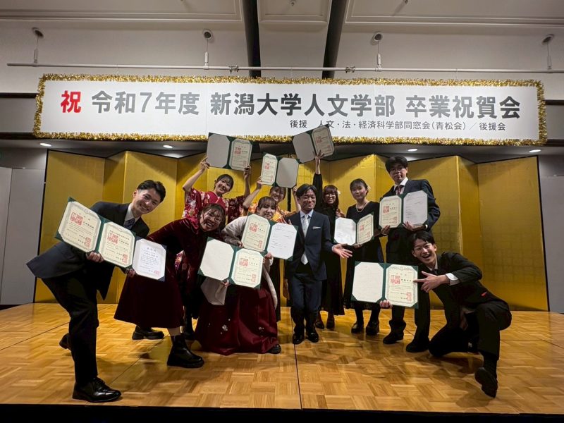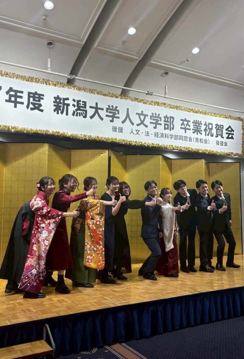 充実した学生生活も終わりを迎え、4月からはそれぞれが新たなスタートを切ることになります。壁にぶつかり悩むこともたくさんあると思います。しかし、そのときには新潟大学の人文学部で培ってきた探究心と築いてきたつながりが、私たちを支えてくれると思います。周りの人と共に、よく考え自ら行動し続ければ道は開けるという新潟大学人文学部での経験を胸に、困難を乗り越えていきます。