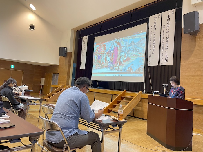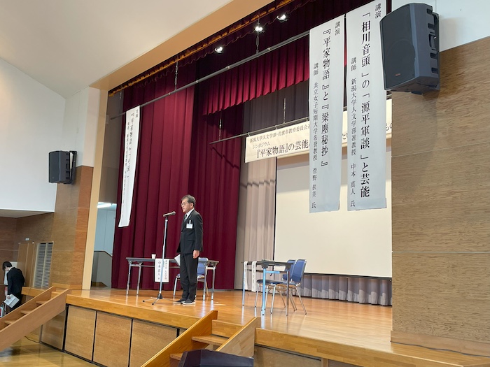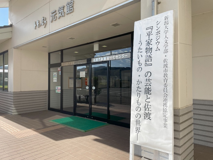 令和6年11月3日(日)、佐渡市の新穂トキのむら元気館で、新潟大学人文学部主催、佐渡市教育委員会共催のシンポジウム「『平家物語』の芸能と佐渡」が行われました。本シンポジウムは平成22年に締結された連携協定に基づき、佐渡市内の研究成果を広く市民に共有するための取り組みです。