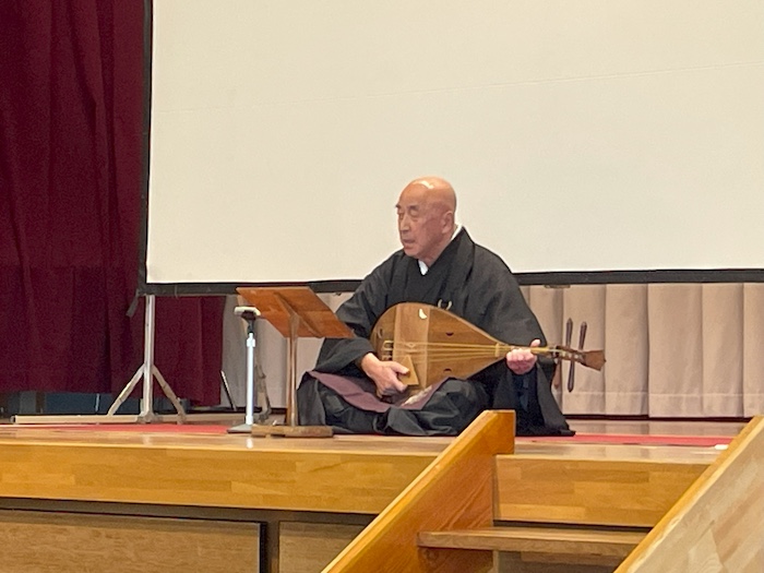 実演では、平家琵琶奏者でもある鈴木孝庸名誉教授が『平家物語』「弓流」を披露しました。琵琶の音と共に「弓流し」の物語が会場に響き渡り、来場者全員がその音色に聞き入りました。