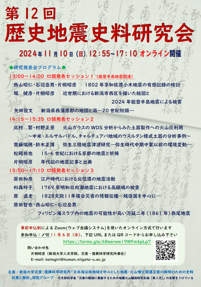 第12回「歴史地震史料研究会」が開催されます。本研究会を主催する研究グループには、人文学部の教員が6名参加しています。今回の研究会では、堀健彦教授、原直史教授、片桐昭彦准教授が発表を行います。