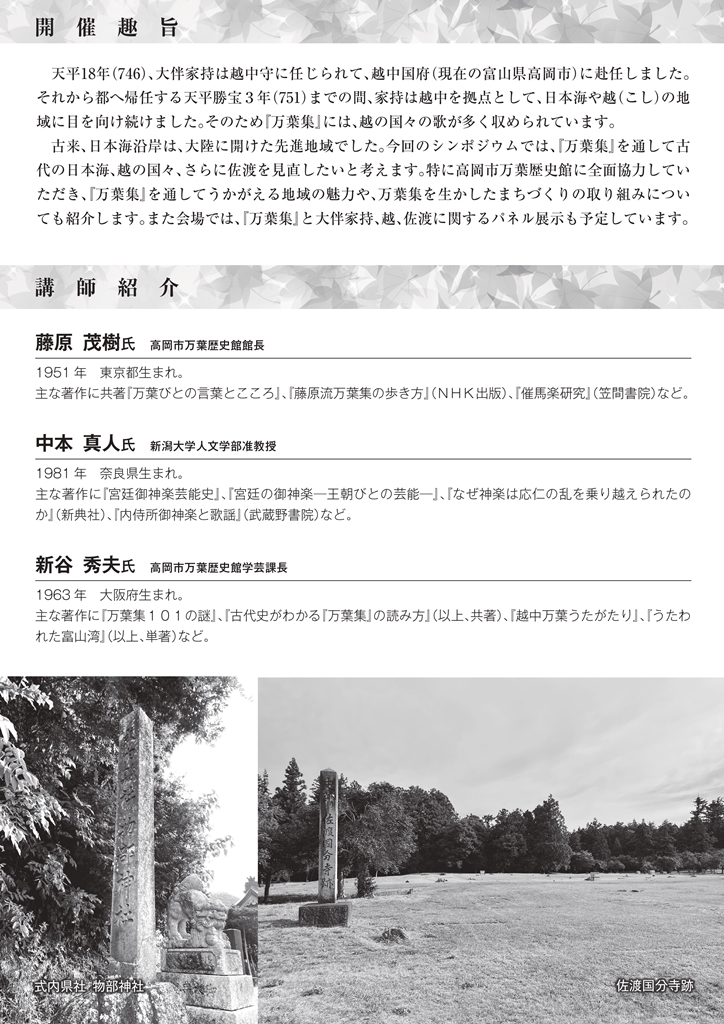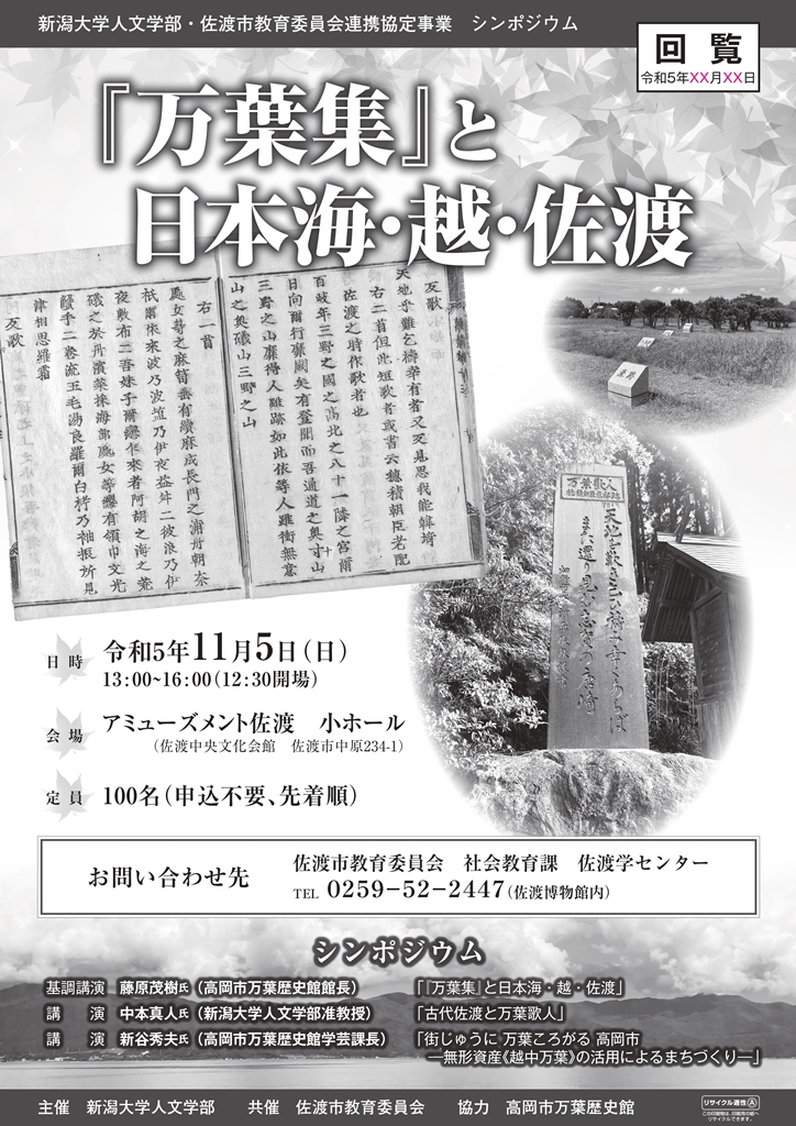 主催 新潟大学人文学部 共催 佐渡市教育委員会 協力 高岡市万葉歴史館
